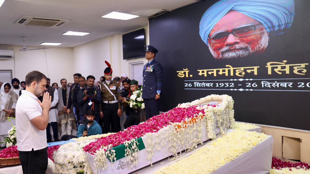 कांग्रेस मुख्यालय में पूर्व प्रधानमंत्री मनमोहन सिंह के पार्थिव शरीर को श्रद्धांजलि देते लोकसभा में नेता प्रतिपक्ष राहुल गांधी।