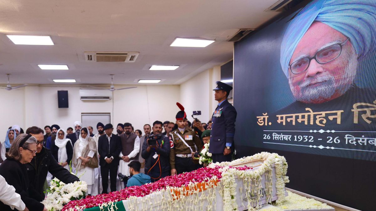 पूर्व प्रधानमंत्री मनमोहन सिंह के पार्थिव शरीर को श्रद्धांजलि देती कांग्रेस की वरिष्ठ नेता सोनिया गांधी व साथ में अजय माकन।