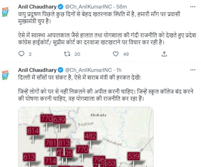 इतना ही नहीं, अनिय चौधरी ने दिल्ली के मुख्यमंत्री अरविंद केजरीवाल पर भी खूब निशाना साधा। अपने ट्विटर हैंडल पर उन्होंने लिखा कि वायु प्रदूषण पिछले कुछ दिनों से बेहद खतरनाक स्थिति में है, हमारी मांग पर प्रवासी मुख्यमंत्री चुप है। ऐसे में स्वास्थ्य आपातकाल जैसे हालात तथा योगशाला की गंदी राजनीति को देखते हुए प्रदेश कांग्रेस हाईकोर्ट/ सुप्रीम कोर्ट का दरवाजा खटखटाने पर विचार कर रही है।