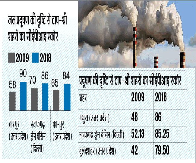 यह रिपोर्ट बताती है कि देश भर में 88 औद्योगिक कलस्टर हैं। प्रदूषण के लिहाज से इनकी स्थिति साल दर साल बिगड़ती जा रही है। खासकर 2009 से 2018 तक एक दशक में इन सभी कलस्टरों में वायु, जल एवं भूमि तीनों ही तरह के प्रदूषण में बड़े पैमाने पर इजाफा हुआ है। 88 में से 35 कलस्टर तो ऐसे हैं, जहां ओवरआल गिरावट आई है। दिल्ली का नजफगढ़ ड्रेन बेसिन हर दृष्टि से प्रदूषित हो रहा है। इन सभी के सीईपीआइ (काम्प्रीहेंसिव एन्वायरमेंट पल्यूशन इंडेक्स) स्कोर में बड़ी वृद्धि देखी गई है।