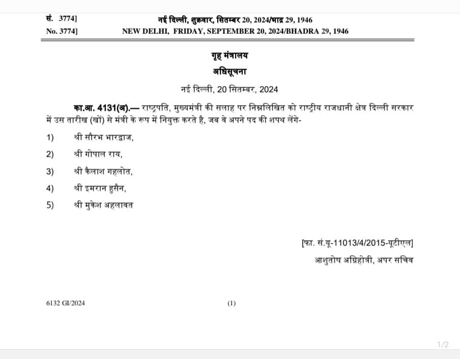 राष्ट्रपति द्रौपदी मुर्मू ने आप पार्टी के संयोजक अरविंद केजरीवाल का इस्तीफा स्वीकार कर लिया है और आम आदमी पार्टी की नेता आतिशी को दिल्ली की मुख्यमंत्री नियुक्त कर दिया है। इसके साथ ही राष्ट्रपति ने पांच मंत्रियों की नियुक्ति को भी मंजूरी दे दी है। सभी को शपथ ग्रहण समारोह के लिए 21 सितंबर को राजभवन बुलाया गया है।