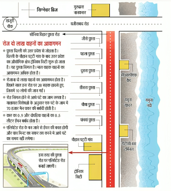 पूर्वी दिल्ली के पुश्ता रोड पर बनने वाली 6 किलोमीटर लंबी एलिवेटेड रोड से सोनिया विहार के लोगों को जाम की समस्या से निजात मिलेगी। इस प्रोजेक्ट की लागत 500 करोड़ रुपये है और यह नानकसर गुरुद्वारे से शुरू होकर उत्तर प्रदेश के ट्रोनिका सिटी तक जाएगी। एलिवेटेड रोड से दिल्ली के विकास को गति मिलेगी और यातायात की समस्या कम होगी।