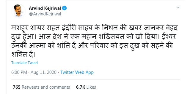 इधर, दिल्ली के मुख्यमंत्री अरविंद केजरीवाल ने व्यक्त दुख व्यक्त किया है। केजरीवाल ने ट्वीट कर कहा कि मशहूर शायर राहत इंदौरी साहब के निधन की खबर जानकर बेहद दुख हुआ। आज देश ने एक महान शख्सियत को खो दिया। ईश्वर उनकी आत्मा को शांति दें और परिवार को इस दुख को सहने की शक्ति दें।