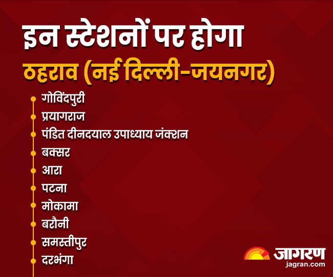 नई दिल्ली से यह त्योहार विशेष ट्रेन 26 व 29 अक्टूबर और एक व चार नवंबर को अपराह्न 2.20 बजे प्रस्थान कर अगले दिन अपराह्न 3.40 बजे जयनगर पहुंचेगी। वापसी में 27 व 30 अक्टूबर और दो व पांच नवंबर को जयनगर से शाम छह बजे रवाना होकर अगले दिन 6.50 बजे नई दिल्ली पहुंचेगी।