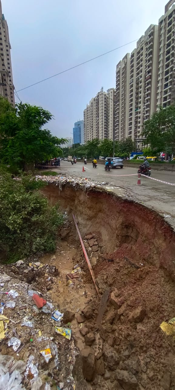 ग्रेटर नोएडा वेस्ट में वर्षा के बाद शाहबेरी के पास सड़क भी धंस गई है।