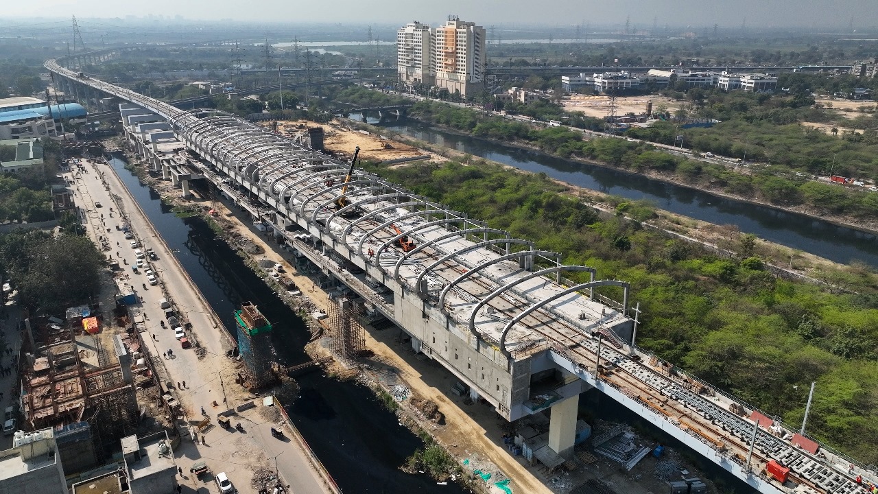 दिल्ली खंड में नौ किमी एलिवेटेड, जबकि पांच किमी भूमिगत हिस्सा है। भूमिगत हिस्सा पहले ही बनकर तैयार हो चुका है। एलिवेटिड खंड मे लगभग आठ किमी वायाडक्ट का निर्माण कार्य पूरा हो चुका है और अब सिर्फ एक किमी बाकी है। आधारभूत ढांचा तैयार होने के साथ साथ सभी स्टेशनों में फिनिशिंग के कार्य भी जारी हैं।