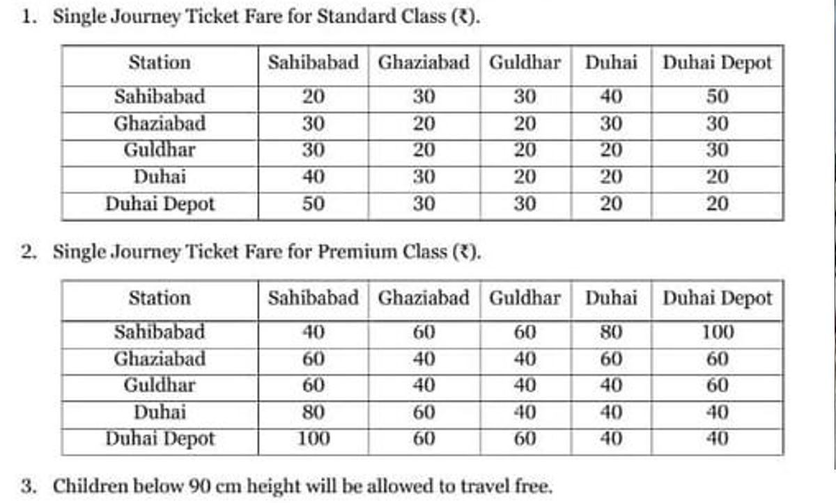 टिकट दो श्रेणी में दिए जाएंगे। स्टैंडर्ड क्लास में सबसे कम किराया 20 रुपया है जबकि प्रीमियम क्लास में सबसे कम किराया दोगुना यानी 40 रुपया होगा। यात्रियों को गाजियाबाद से दुहाई डिपो जाने के लिए 30 रुपये देने होंगे। इसी तरह गुलधार से दुहाई डिपो जाने के लिए भी यात्रियों को 30 ही रुपये देने होंगे। दुहाई से दुहाई डिपो तक का किराया 20 रुपया है। यह किराया स्टैंडर्ड क्लास का है। किराये की प्रति किमी दर 2.94 रुपये है।