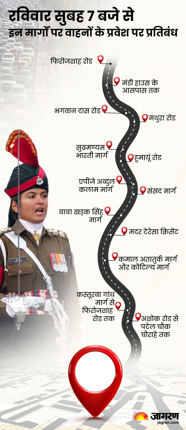 रविवार सुबह 10.30 बजे से तिलक मार्ग, बीएसजेड मार्ग और सुभाष मार्ग पर दोनों दिशाओं में यातायात की अनुमति नहीं होगी। पुलिस ने कहा, परेड की आवाजाही के आधार पर ही क्रॉस ट्रैफिक की अनुमति दी जाएगी। इसमें कहा गया है कि लोगों से अनुरोध है कि वे अपनी यात्रा की योजना पहले से बनाएं और अपनी सुविधा के लिए सुबह 9.30 बजे से दोपहर 1 बजे तक परेड के मार्ग से बचें।