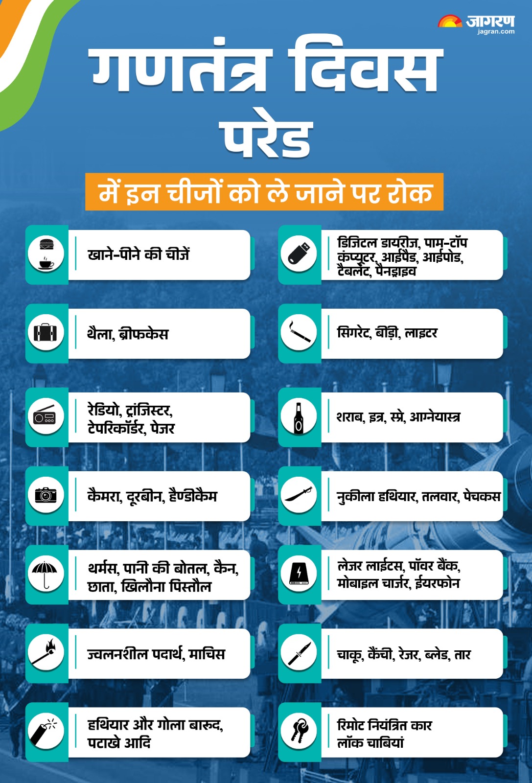 इसमें कहा गया है कि आवश्यक सेवाओं को छोड़कर किसी भी भारी परिवहन, मध्यम या हल्के मालवाहनों को बुधवार रात 9 बजे से परेड खत्म होने तक दिल्ली की सीमाओं में प्रवेश करने की अनुमति नहीं दी जाएगी। इसमें कहा गया है कि यदि कोई अज्ञात वस्तु या संदिग्ध व्यक्ति देखा जाता है, तो ड्यूटी पर तैनात निकटतम पुलिसकर्मी को जानकारी दी जानी चाहिए।
