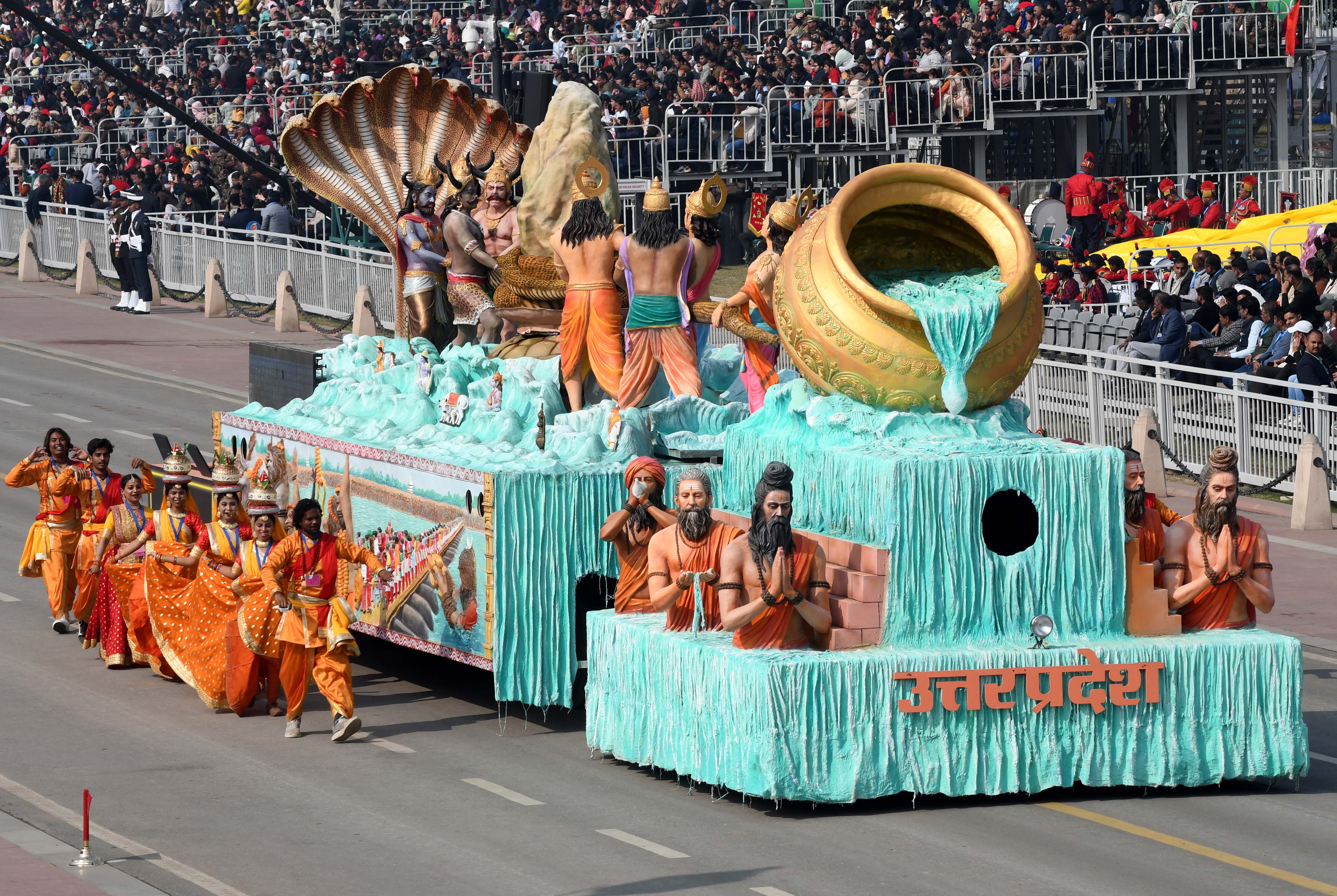 उत्तर प्रदेश की झांकी में पवित्र गंगा, अविरल यमुना और पौराणिक सरस्वती के संगम पर हो रहे महाकुंभ का दिव्य स्वरूप देखने को मिला।