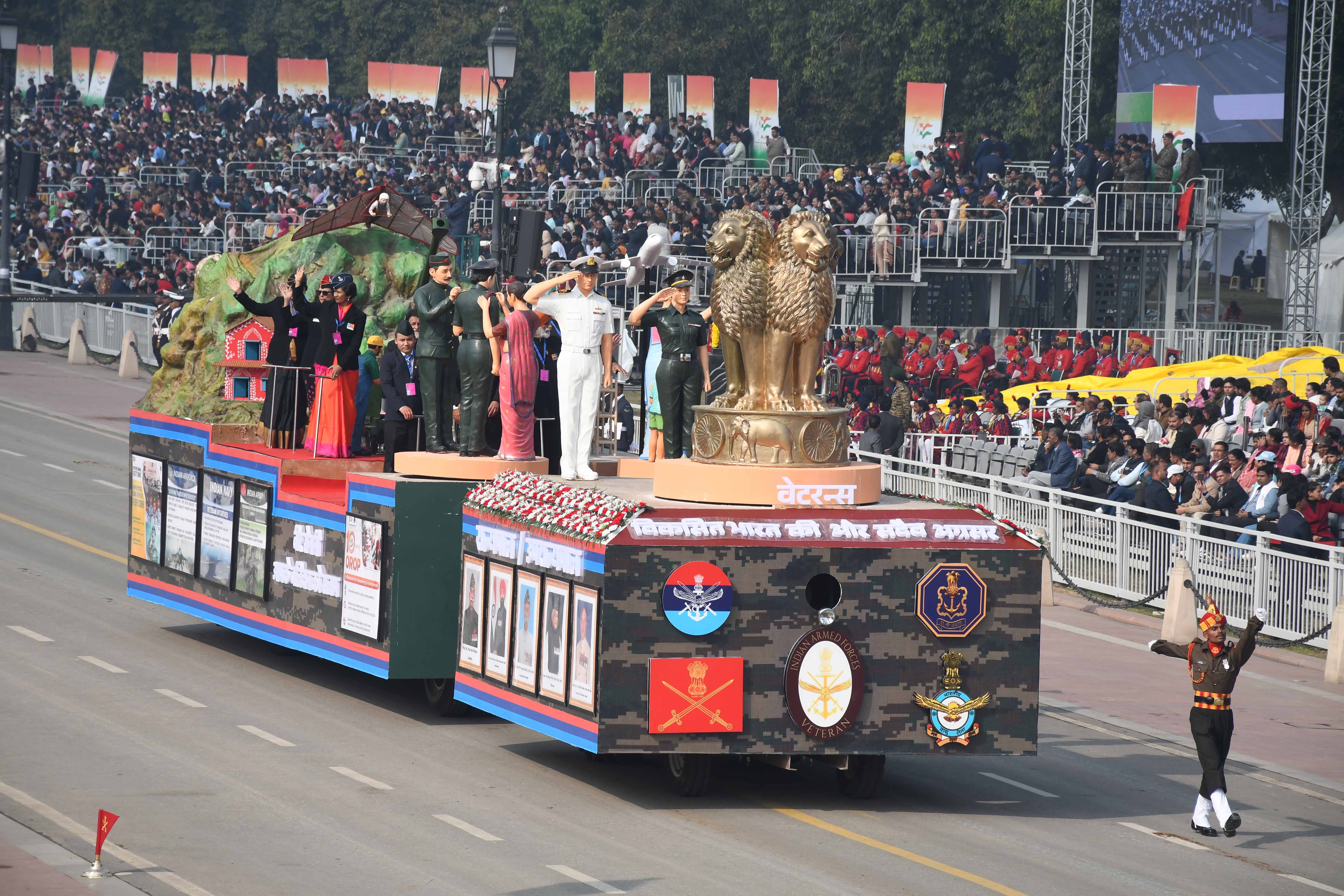(नई दिल्ली कर्तव्य पथ पर गणतंत्र दिवस परेड की फुल ड्रेस रिहर्सल समारोह में वेटरन्स झांकी, जिस पर लिखा है कि विकसित भारत की ओर सदैव अग्रसर। ध्रुव कुमार)