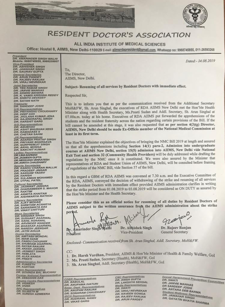NMC Bill 2019: एम्स के रेजिडेंट डॉक्टरों ने खत्म की हड़ताल, सोमवार को OPD में रहेंगे मौजूद