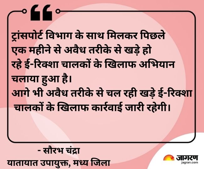 अवैध तरीके से इन ई-रिक्शा के खड़े होने से रोड पर गाड़ियां फंसी रहती हैं और यातायात पुलिसकर्मी इन रिक्शा चालकों पर कार्रवाई करने के बजाय मूकदर्शक बने रहते हैं। दिन भर जाम की स्थिति बनने रहने से प्रदूषण भी बढ़ रहा है।