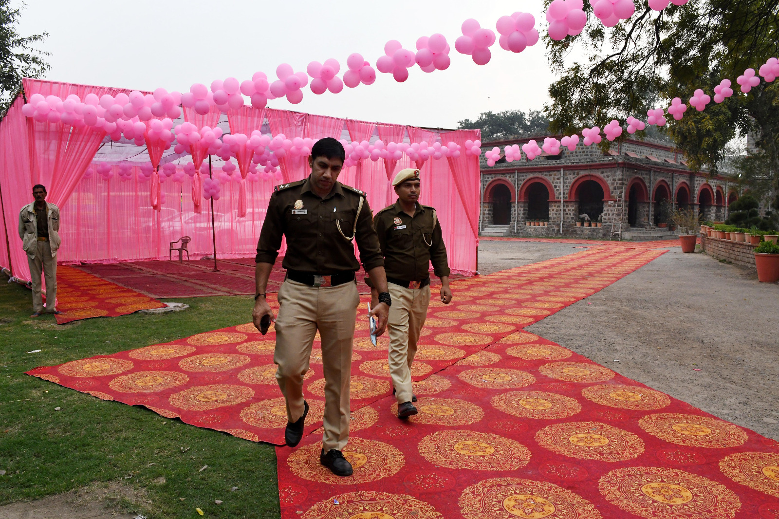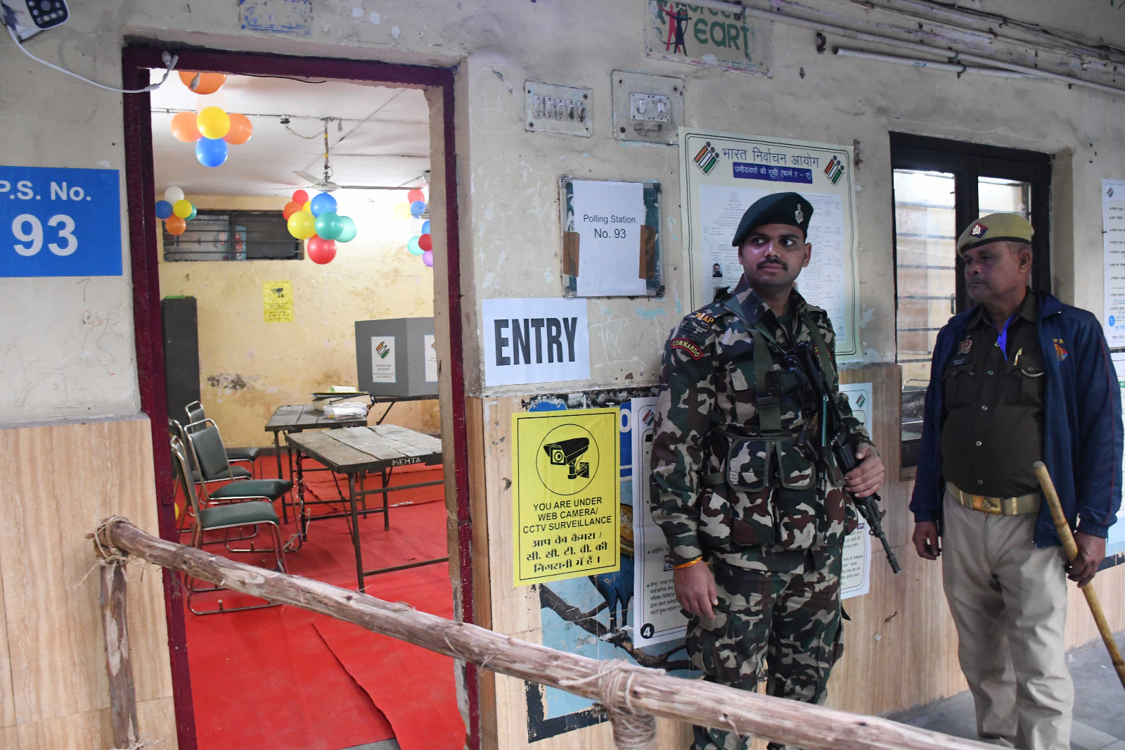 विधानसभा चुनाव के मतदान के लिए कड़ी सुरक्षा में तैयार तुर्कमान गेट स्थित स्कूल का एक आदर्श मतदान केंद्र। ध्रुव कुमार