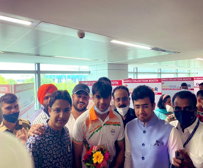 भाला फेंक प्रतियोगिता में स्वर्ण पदक जीतने वाले नीरज चोपड़ा का भी जोरदार स्वागत किया गया। नीरज चोपड़ा का स्वागत करने के लिए भाजपा सांसद तेजस्वी सूर्या भी पहुंचे।