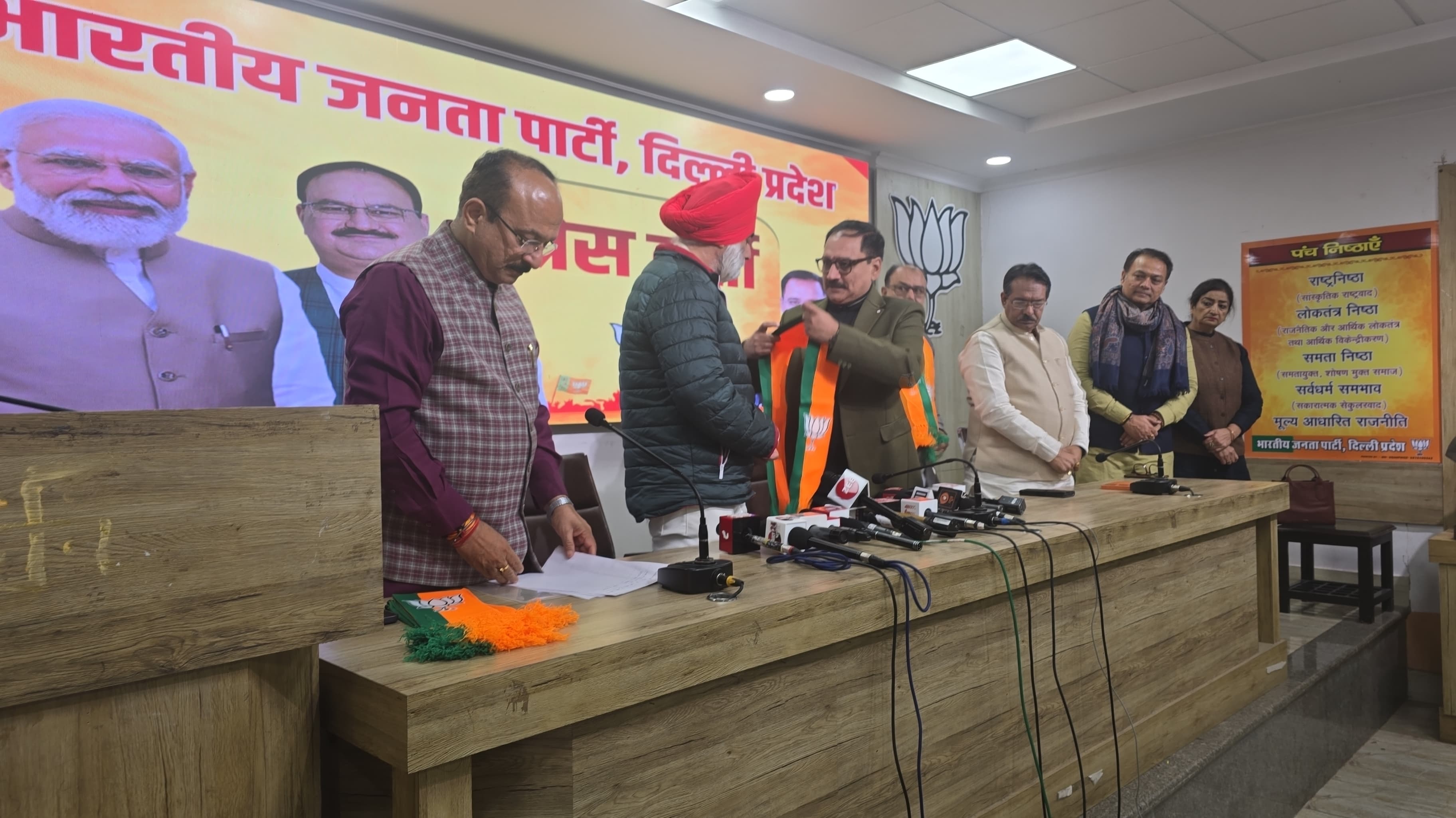 दिल्ली सिख गुरुद्वारा प्रबंधक कमेटी के सदस्य बलबीर सिंह का भाजपा में स्वागत करते हुए प्रदेश अध्यक्ष वीरेंद्र सचदेवा।