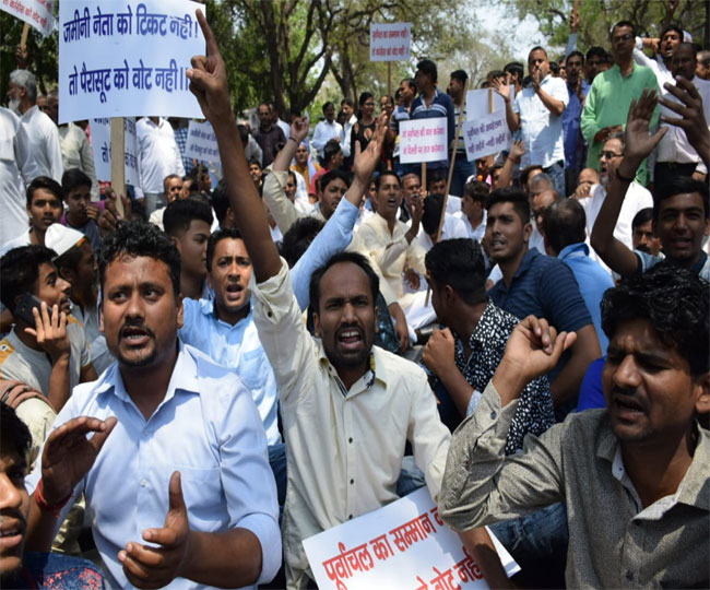 प्रदर्शन कर रहे दोनों नेताओं के समर्थकों का आरोप है कि पार्टी ने बाहरी नेता को उम्मीदवार बनाया है। प्रदर्शनकारियों की मांग है कि उत्तर पश्चिमी दिल्ली से राजकुमार चौहान को पार्टी का उम्मीदवार बनाया जाए।जबकि पश्चिमी दिल्ली सीट से महाबल मिश्रा को प्रत्याशी घोषित किया जाए।