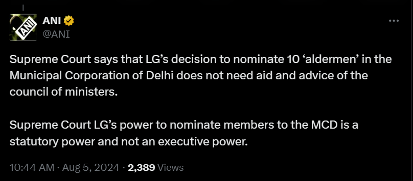 Supreme Court ने उपराज्यपाल द्वारा एल्डरमैन की नियुक्ति को सही ठहराया है। सुप्रीम कोर्ट ने माना है कि दिल्ली नगर निगम में सदस्यों को नामित करने की दिल्ली के उपराज्यपाल की शक्ति एक वैधानिक शक्ति है न कि कार्यकारी शक्ति। इसलिए दिल्ली के उपराज्यपाल अपने विवेक के अनुसार कार्य कर सकते हैं न कि दिल्ली सरकार की सहायता और सलाह के अनुसार।