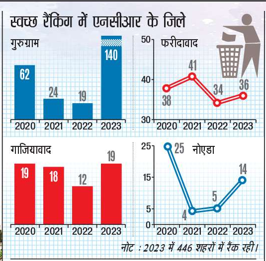 स्वच्छ सर्वेक्षण 2023 में 446 शहरी स्थानीय निकायों में दिल्ली नगर निगम, गाजियाबाद, गुरुग्राम, फरीदाबाद फिर से फिसड्डी साबित हुए हैं। दिल्ली-एनसीआर में केवल नोएडा कुछ उम्मीद जताता है, वर्ष 2018 के सर्वे में नोएडा की राष्ट्रीय रैंकिंग 324 थी जो अब 14वीं है।