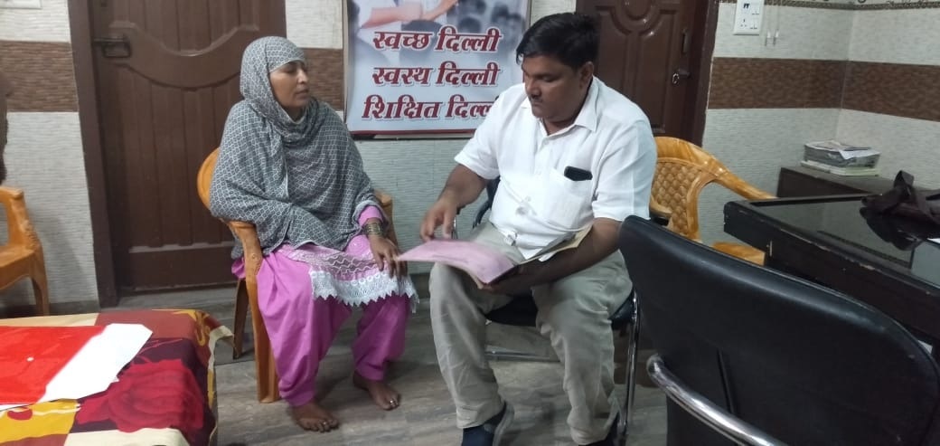 (महिला से बात करते हुए ताहिर हुसैन। फाइल फोटो)