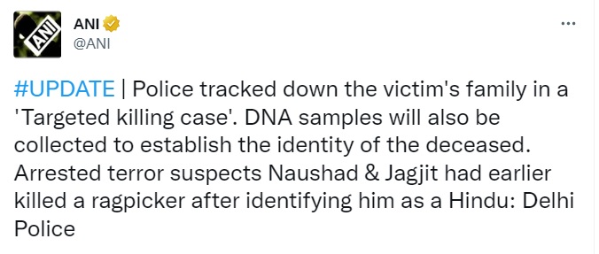 समाचार एजेंसी ने दिल्ली पुलिस के हवाले से बताया कि पुलिस ने 'टार्गेट किलिंग केस' में पीड़ित परिवार का पता लगाया है, मृतक की शिनाख्त के लिए DNA सैंपल भी लिए जाएंगे। गिरफ्तार संदिग्धों आतंकियों (नौशाद और जगजीत) ने पहले एक कूड़ा बीनने वाले को हिंदू के रूप में पहचानने के बाद उसकी हत्या कर दी थी।