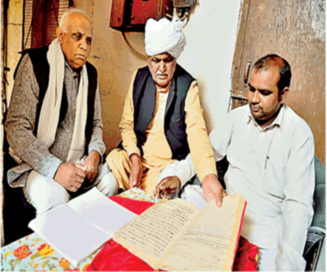 दस्तावेजों में दर्ज पालम का इतिहास दिखाते गांव के प्रधान रामकरण सोलंकी (बीच में) व अन्य लोग। जागरण