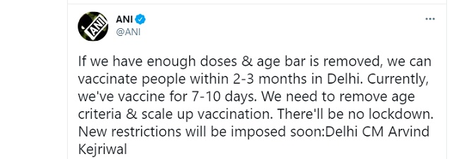 उन्होंने बताया कि इस बाबत मैंने प्रधानमंत्री को चिट्ठी लिखी है कि सभी को टीका लगाने की छूट दी जाए और टीकाकरण केंद्र बढ़ाने की छूट दी जाए तो हम दो से तीन महीने में पूरी दिल्ली को टीका लगा देंगे। अरविंद केजरीवाल ने यह भी बताया कि अभी बचाव के लिए हमारी कुछ और सख्ती करने की तैयारी है, उसके बारे में जल्दी जानकारी देंगे, लेकिन लॉकडाउन नहीं लगेगा।