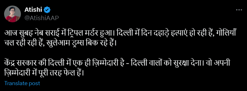 वारदात को लेकर दिल्ली की मुख्यमंत्री आतिशी ने केंद्र सरकार पर हमला बोला है। उन्होंने एक्स पर पोस्ट कर कहा, आज सुबह नेब सराय में ट्रिपल मर्डर हुआ। दिल्ली में दिन दहाड़े हत्याएं हो रही हैं, गोलियां चल रही रही हैं, खुलेआम ड्रग्स बिक रहे हैं। केंद्र सरकार की दिल्ली में एक ही जिम्मेदारी है - दिल्ली वालों को सुरक्षा देना। वो अपनी जिम्मेदारी में पूरी तरह फेल हैं।"