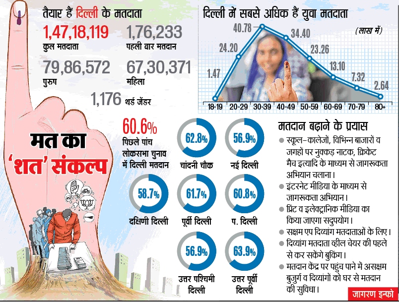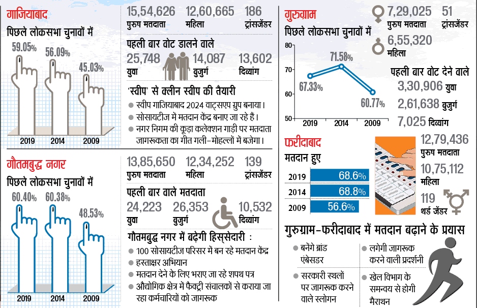 लोकसभा चुनाव के मतदान की तिथियां घोषित हो चुकी हैं। एक ओर विभिन्न दलों के प्रत्याशी मतदाताओं को अपने पक्ष में करने में जुट गए हैं वहीं चुनाव आयोग भी मतदान बढ़ाने की चुनौती के लिए प्रयास कर रहा है। मतदान में लोगों की अधिकतम भागीदारी कैसे सुनिश्चित की जाए। इसके लिए नए प्रयोग हो रहे हैं। आइए आंकड़ों के माध्यम से एनसीआर में मतदान का परिदृश्य समझते हैं।