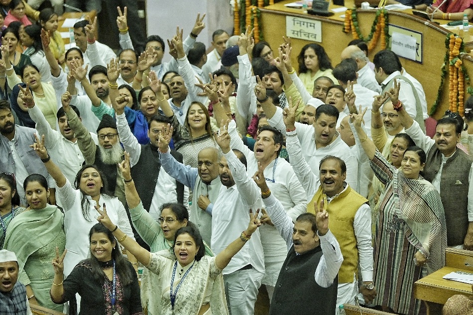 (नगर निगम महापौर चुनाव का परिणाम घोषित होने पर खुशी मनाते आम आदमी पार्टी के पार्षद। चंद्र प्रकाश मिश्र)