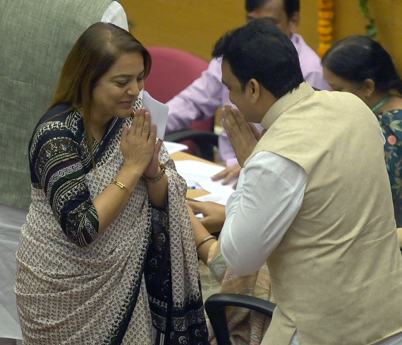 (नगर निगम में चुनाव का परिणाम घोषित होने के बाद पूर्व महापौर डा. शैली ओबेराय से हाथ जोड़कर अभिवादन करते विजयी प्रत्याशी महेश कुमार। चंद्र प्रकाश मिश्र)