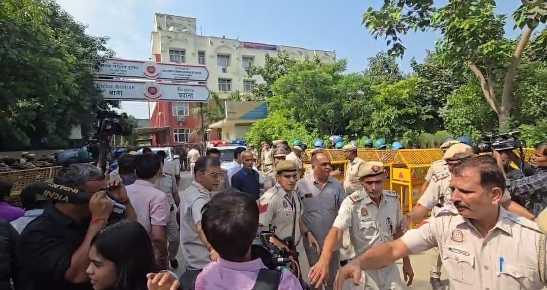 बवाना थाने के बाहर भीड़ को व्यवस्थित करते हुए पुलिस के जवान।