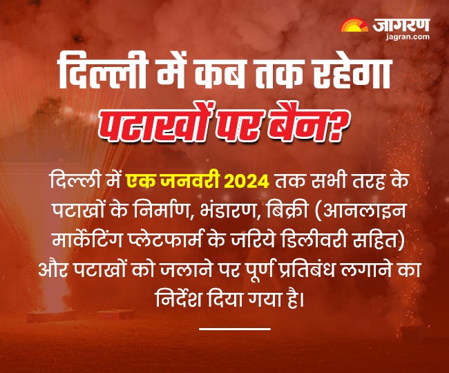 दिल्ली प्रदूषण नियंत्रण समिति (डीपीसीसी) द्वारा जारी अधिसूचना के मुताबिक दिल्ली में एक जनवरी 2024 तक सभी तरह के पटाखों के निर्माण, भंडारण, बिक्री (आनलाइन मार्केटिंग प्लेटफार्म के जरिये डिलीवरी सहित) और पटाखों को जलाने पर पूर्ण प्रतिबंध लगाने का निर्देश दिया गया है।