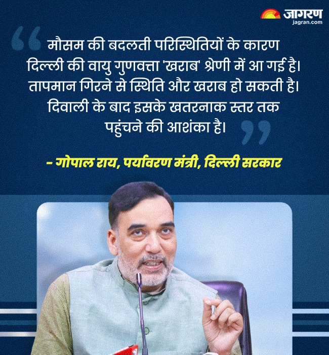 पीटीआई, नई दिल्ली। पर्यावरण मंत्री गोपाल राय ने शनिवार को कहा कि बदलते मौसम की स्थिति के कारण दिल्ली की वायु गुणवत्ता 'खराब' श्रेणी में पहुंच गई है और दिवाली के बाद प्रदूषण का स्तर और खराब होने की आशंका है। राय ने बताया कि दिल्ली सरकार धूल प्रदूषण को नियंत्रित करने के लिए हर संभव प्रयास कर रही है और उसे स्थानीय निवासियों के सहयोग की जरूरत है।