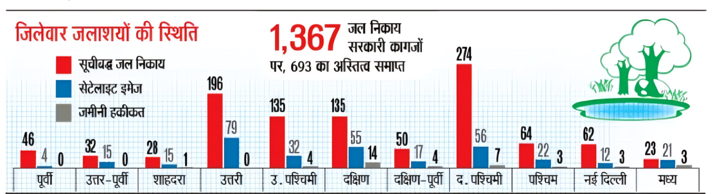 वर्ष 2021 में राजस्व रिकार्ड के अनुसार, दिल्ली में 1045 और उसके बाद जियोस्पेशियल दिल्ली लिमिटेड (जीएसडीएल) द्वारा उपग्रह चित्र से 322 अन्य जल निकायों की पहचान की गई है। इस तरह से दिल्ली में कागजों पर कुल 1367 जल निकाय हैं। लेकिन, जमीनी सच्चाई इससे अलग है। 1045 में से सिर्फ 631 का अस्तित्व बचा हुआ है।