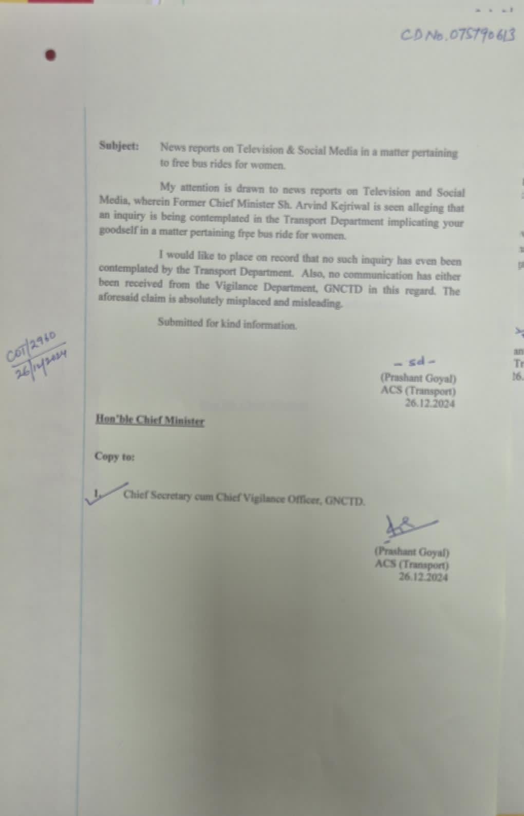 दिल्ली की मुख्यमंत्री आतिशी के खिलाफ जांच किए जाने और उन्हें गिरफ्तार करने की आशंका संबंधी पूर्व मुख्यमंत्री अरविंद केजरीवाल के बयानों को लेकर परिवहन विभाग ने पत्र लिखकर साफ किया कि ऐसी कोई जांच नहीं चल रही है। हाल ही में दिए गए केजरीवाल के बयान बेबुनियाद हैं।