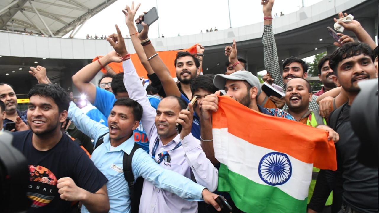 टी-20 विश्वकप विजेता भारतीय टीम गुरुवार को स्वदेश लौट आई है। दिल्ली के आईजीआई एयरपोर्ट के बाहर निकलते ही फैंस ने पूरे हर्षोल्लास के साथ खिलाड़ियों का स्वागत किया। एयरपोर्ट से विशेष बस में बैठकर टीम इंडिया करीब साढ़े सात बजे आईटीसी मौर्य होटल पहुंचीं।