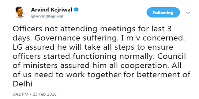 सीएम केजरीवाल ने ट्वीट कर कहा कि अधिकारी पिछले 3 दिनों से बैठकों में भाग नहीं ले रहे हैं। दिल्ली में शासन के काम में बाधा आ रही है। एलजी ने आश्वासन दिया है कि अधिकारियों को सामान्य रूप से काम शुरू करने के लिए वे सभी कदम उठाएंगे। मंत्रिपरिषद ने सभी सहयोग का आश्वासन दिया है। हम सभी को दिल्ली की भलाई के लिए मिलकर काम करना चाहिए।