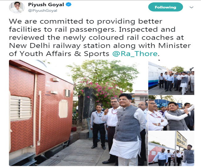 रेल मंत्री पीयूष गोयल ने इन रेल डिब्बों को नए रंग में देखा और रेलवे अधिकारियों को सलाह दी। रेल मंत्री ने कहा कि देश भर में चलने वाले सभी रेल डिब्बों को नए रंगों में रंगा जाएगा, इससे रेलवे को और ज्यादा आकर्षक बनाया जा सकेगा। रेल मंत्री ने अधिकारियों से बात की और कहा कि पूरे देश में रेलवे के लुक को बदलने और ज्यादा सुविधाएं देने के लिए उनका मंत्रालय प्रयासरत है। रेलवे में तकरीबन 50 हजार सवारी डिब्बे हैं, इन सभी डिब्बों को तय किए गए कलर स्कीम के मुताबिक रंगा जाएगा।