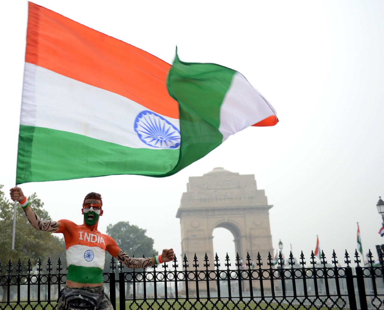 इंडिया गेट पर तिरंगा झंडा लिए युवक