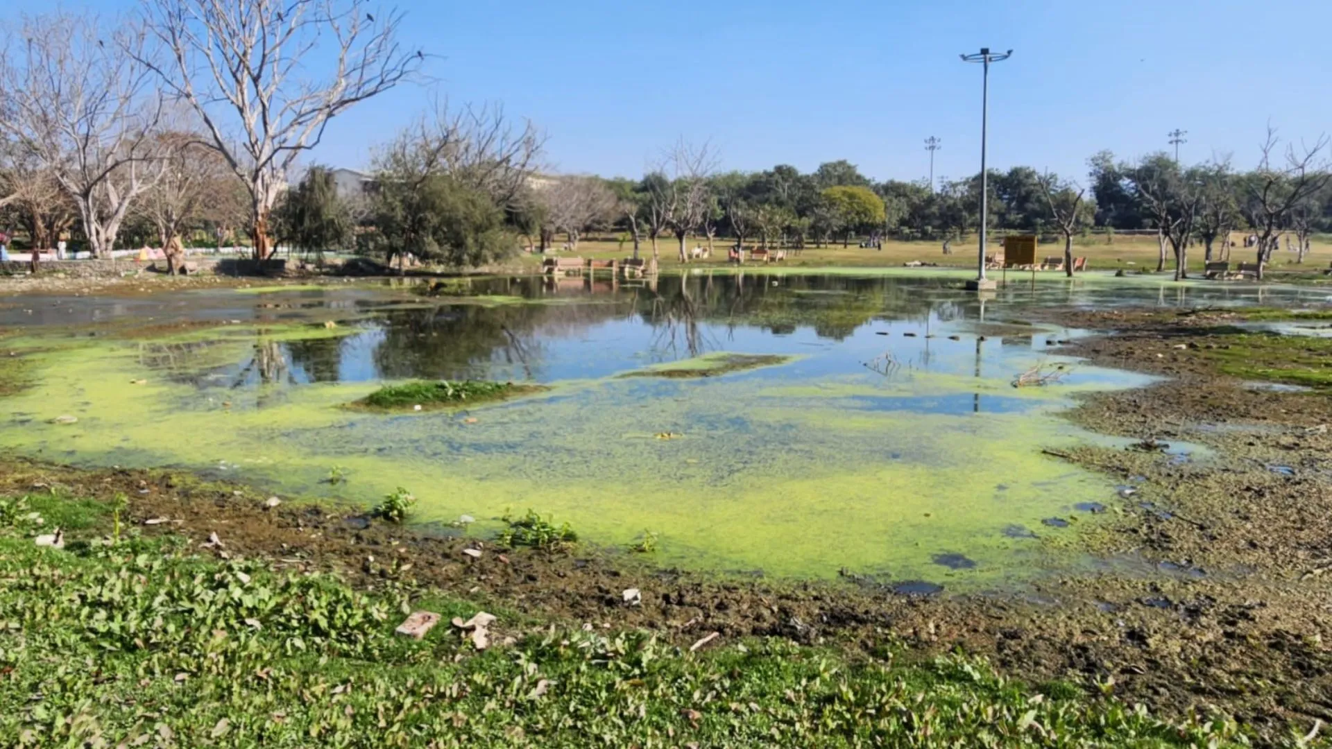 रोहिणी सेक्टर-20 के जिला पार्क में भरे पानी पर तैरती काई। जागरण