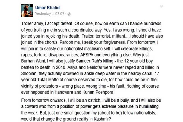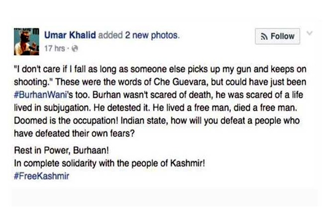 उमर खालिद ने बुरहान वानी के सपोर्ट में फेसबुक पर डाली अपनी कंट्रोवर्शियल पोस्ट हटा दी है। हालंकि इस पोस्ट के बाद खालिद ने वानी से जुड़ी एक और पोस्ट डाली है।