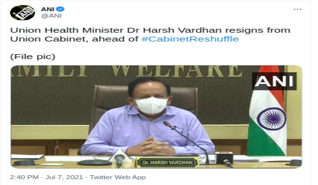 नई दिल्ली, जागरण संवाददाता। केंद्रीय मंत्रिमंडल का बुधवार शाम छह बजे विस्तार किया जाएगा। इस बीच कई मंत्रियों ने इस्तीफा दे दिया है। इन मंत्रियों में दिल्ली भाजपा के वरिष्ठ नेता और केंद्रीय स्वास्थ्य मंत्री डॉ. हर्षवर्धन ने भी मोदी कैबिनेट विस्तार से पहले मंत्री पद से इस्तीफा दे दिया है। समाचार एजेंसी एएनआइ ने भी केंद्रीय स्वास्थ्य मंत्री के इस्तीफे की पुष्टि की है। डॉ. हर्षवर्धन दिल्ली की चांदनी चौक लोकसभा क्षेत्र से सांसद हैं। वह मोदी सरकार के पहले कार्यकाल में भी कैबिनेट मंत्री थे। जब साल 2019 में भाजपा के नेतृत्व में दूसरी बार एनडीए की सरकार बनी तो तब भी वह कैबिनेट मंत्री बनाए।
