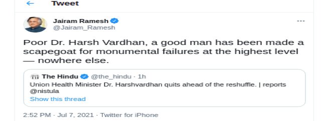 पूर्व केंद्रीय मंत्री और वरिष्ठ कांग्रेस नेता जयराम रमेश ने डॉ हर्षवर्धन के इस्तीफे पर केंद्र और भाजपा पर जमकर निशाना साधा है। जयराम रमेश ने ट्वीट कर कहा कि डॉ हर्षवर्धन भले इन्सान हैं, उन्हें बलि का बकरा बनाया गया है।