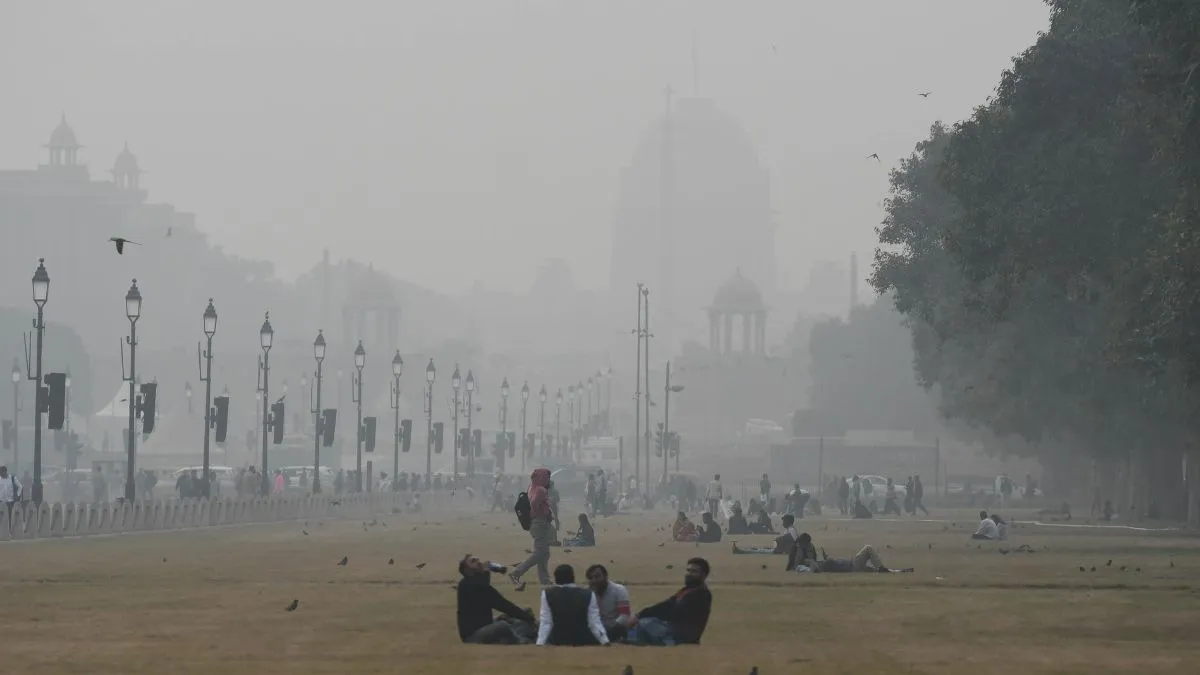 कर्तव्यपथ पर छाए स्मॉग के बीच बैठे पर्यटक। फाइल फोटो