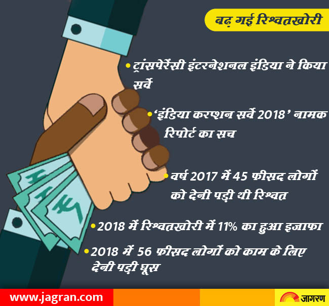 देवेंद्रराज सुथार। हाल ही में ट्रांसपेरेंसी इंटरनेशनल इंडिया एवं लोकल सर्कल्स द्वारा कराए गए एक ऑनलाइन सर्वेक्षण के आंकड़ों पर आधारित ‘इंडिया करप्शन सर्वे 2018’ नामक रिपोर्ट में यह बात सामने आई है कि इस साल 56 प्रतिशत लोगों को अपना काम करवाने के लिए रिश्वत का सहारा लेना पड़ा है। पिछले साल भी संस्था ने सर्वेक्षण कराया था जिसमें यह आंकड़ा 45 प्रतिशत था, जो इस साल 11 फीसद की बढ़ोतरी के साथ 56 प्रतिशत तक पहुंच गया है।