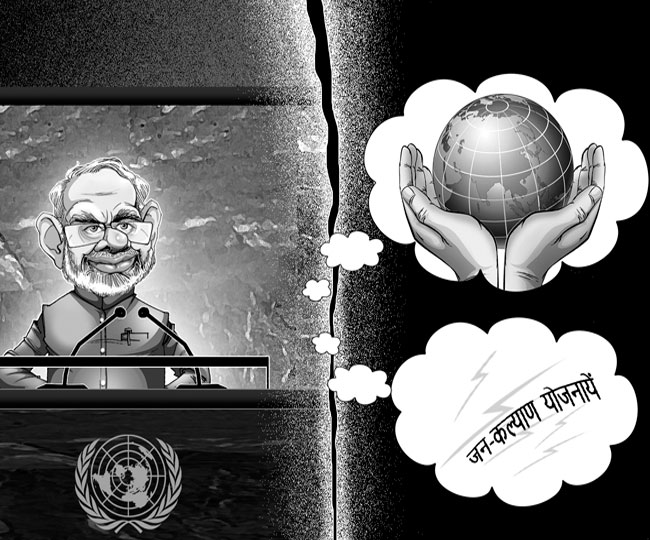 भारत ने पिछले छह वर्षों में जिस तरह विश्व में अपनी जगह बनाई और अपनी जनता के हित के लिए सैकड़ों जन-कल्याण योजनाएं लागू कीं, उसकी भी झलक प्रधानमंत्री ने दुनिया के सामने रखी। देश की तरक्की के लिए प्रधानमंत्री ने रिफॉर्म, परफॉर्म और ट्रांसफॉर्म का नारा दिया। इसका आशय है-पहले सुधारों की परिकल्पना, उसके बाद उन्हें लागू करना और फिर बदलाव करना। भारत ने पांच साल में 40 करोड़ गरीब जनता को बैंकिंग प्रक्रिया से जोड़ा। 60 करोड़ लोगों को खुले में शौच के अभिशाप से मुक्त किया। 15 करोड़ घरों में पानी पहुंचाने और छह लाख गांवों को ब्रॉडबैंड से जोड़ने का संकल्प लिया है। स्वच्छता के लिए देशव्यापी अभियान चलाया है। आज देश टीबी से लगभग मुक्त होने के रास्ते पर चल पड़ा है। करोड़ों लोग मुफ्त चिकित्सा का लाभ ले रहे हैं। गरीबों को सस्ती दरों पर औषधियां उपलब्ध कराई जा रही हैं। यह सब यूं ही नहीं हुआ।