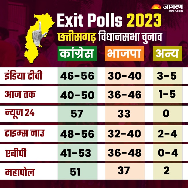 छत्तीसगढ़ में सभी 90 विधानसभा सीटों पर दो चरणों में मतदान हुआ था। छत्तीसगढ़ को लेकर एजेंसियों की ओर से जारी एग्जिट पोल में राज्य में भूपेश बघेल के नेतृत्व में कांग्रेस अपनी सरकार बचाते हुए दिख रही है। हालांकि, भाजपा का प्रदर्शन भी बेहद शानदार रहा है।