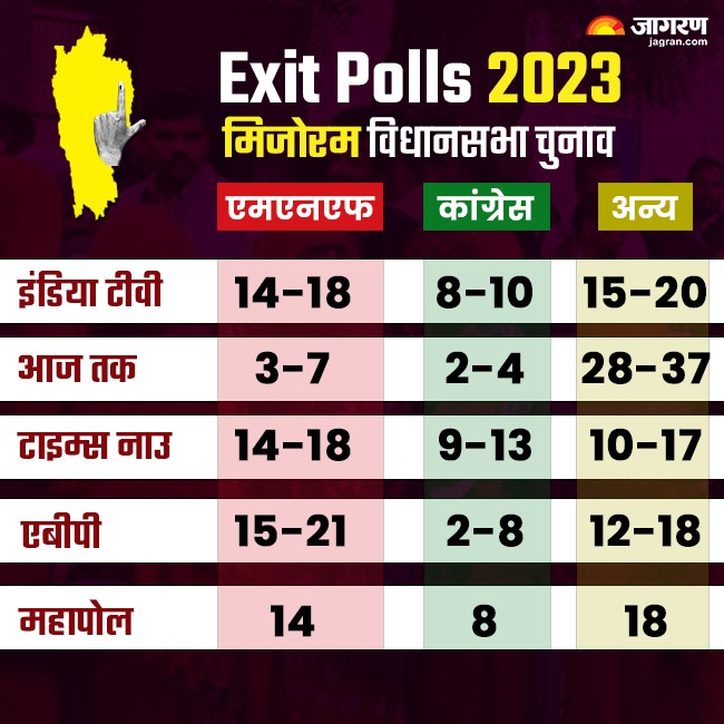 मिजोरम की सभी 40 विधानसभा सीटों पर 17 नवंबर को मतदान हुआ था। मिजोरम विधानसभा चुनाव 2023 को लेकर जारी ज्यादातर पोल में किसी भी पार्टी को बहुतमत मिलता नजर नहीं आ रहा है। यानी कि चुनाव के बाद गठबंधन की सरकार बनेगी।