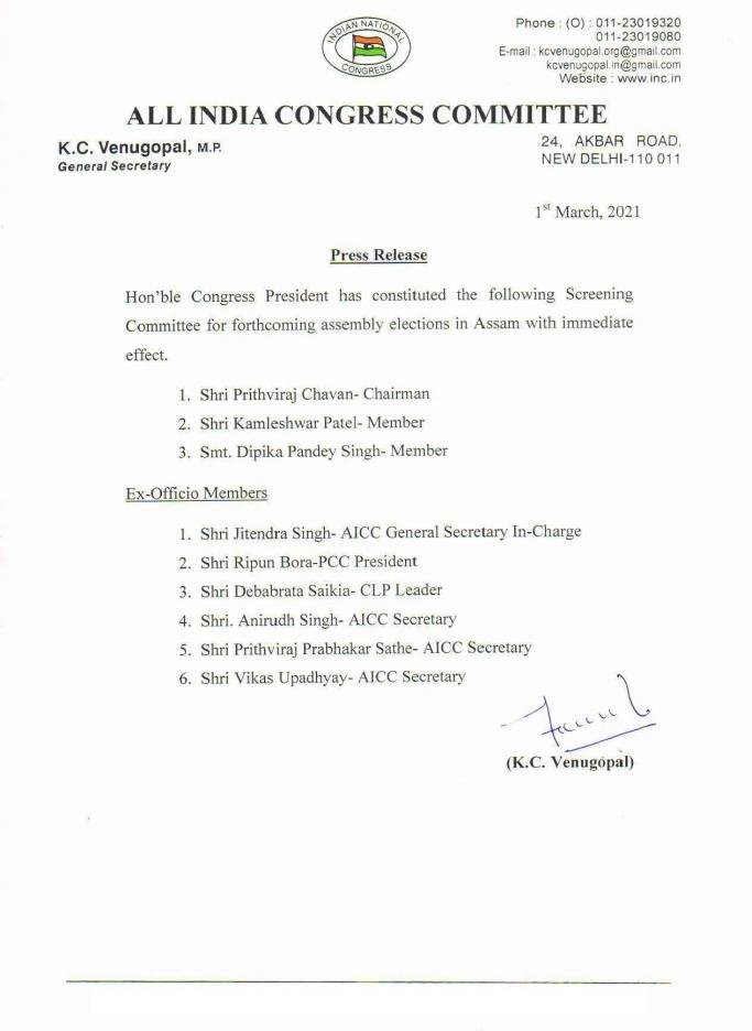 Congress constitutes Screening Committee for the Assam legislative assembly elections. pic.twitter.com/5jXhApu4r0